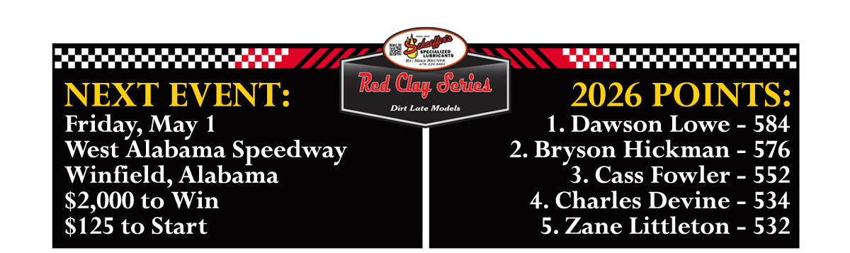 Ryan DelphUp next for the Schaeffer's Oil by Mike Bruner Red Clay 602 Late Model Series will be a trip to West Alabama Speedway this Friday night, May 1! A $2,000...